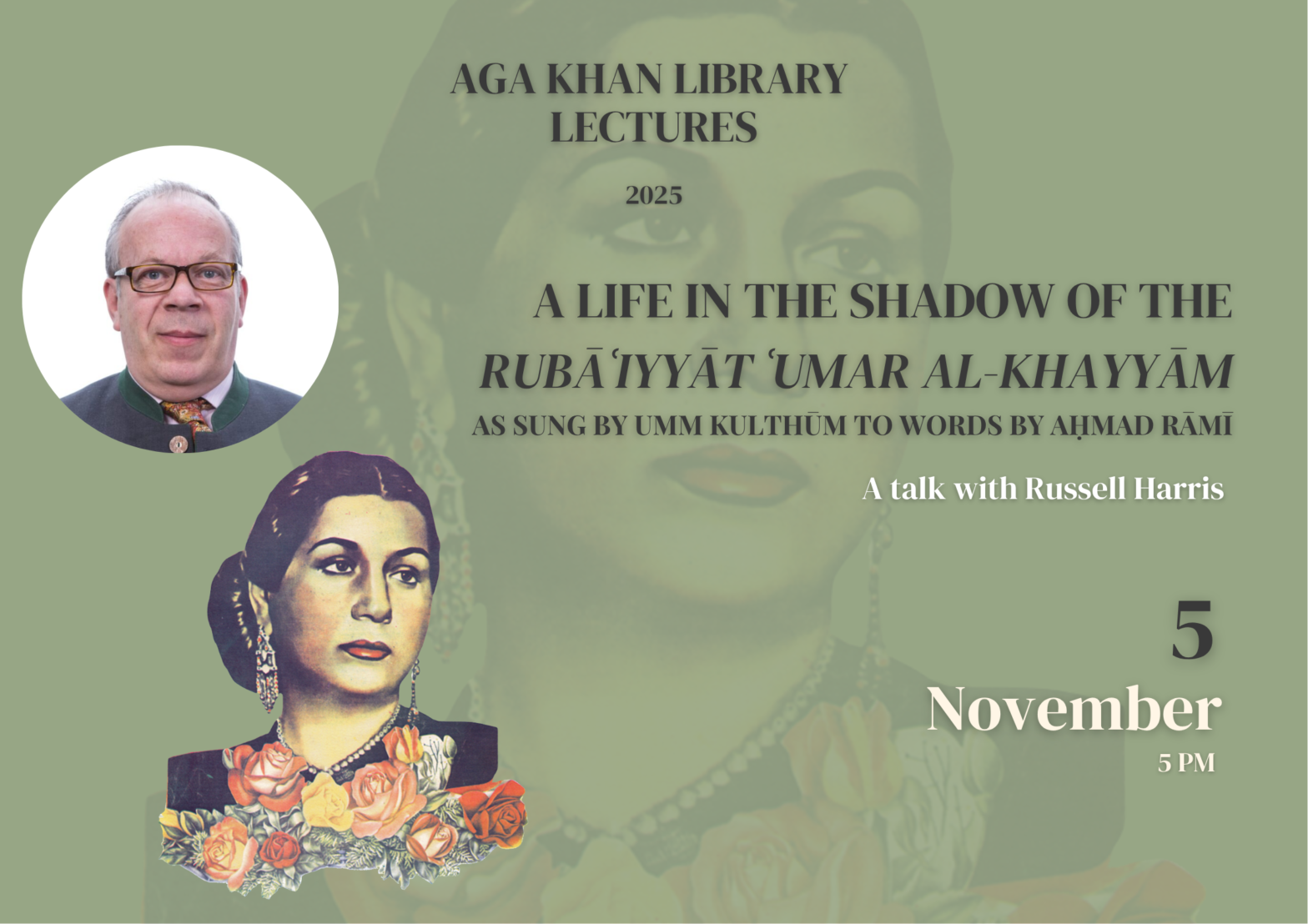 This talk, to be delivered by Russell Harris, speaks of a personal journey – how he discovered the voice and music of Umm Kulthūm in 1970s Liverpool and how she inspired him to learn Arabic in order to understand the texts she sang. The talk covers the inroads made by Persian culture in the 19th century into mainstream literary and musical culture worldwide with particular reference to Edward FitzGerald’s masterly and accidentally epoch-making English reworking of the by-then almost unknown quatrains of Umar Khayyam. The talk will show to some extent how seemingly different cultures are the subject of cultural cross-fertilization and the exchange of styles of poetry. As well as providing some biographic information on perhaps the Arab world’s most significant songstress, Umm Kulthūm, and her lyricist, the great Egyptian ‘poet of the people’, Aḥmad Rāmī, the talk will be enhanced with visual illustrations and short audio examples.